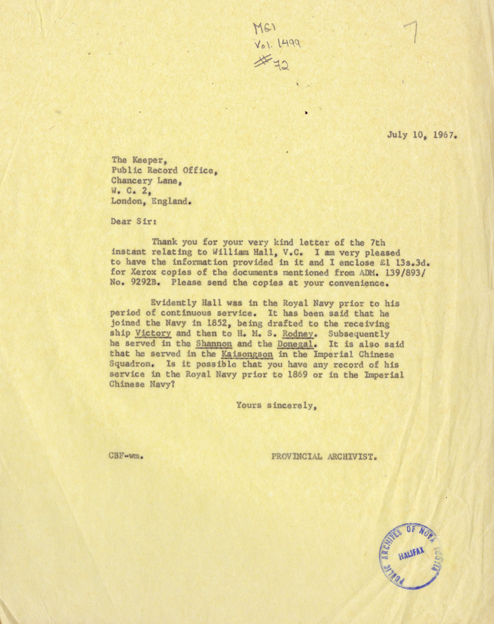 Reference William Hall, VC Nova Scotia Archives MG 1 volume 1499 number 72