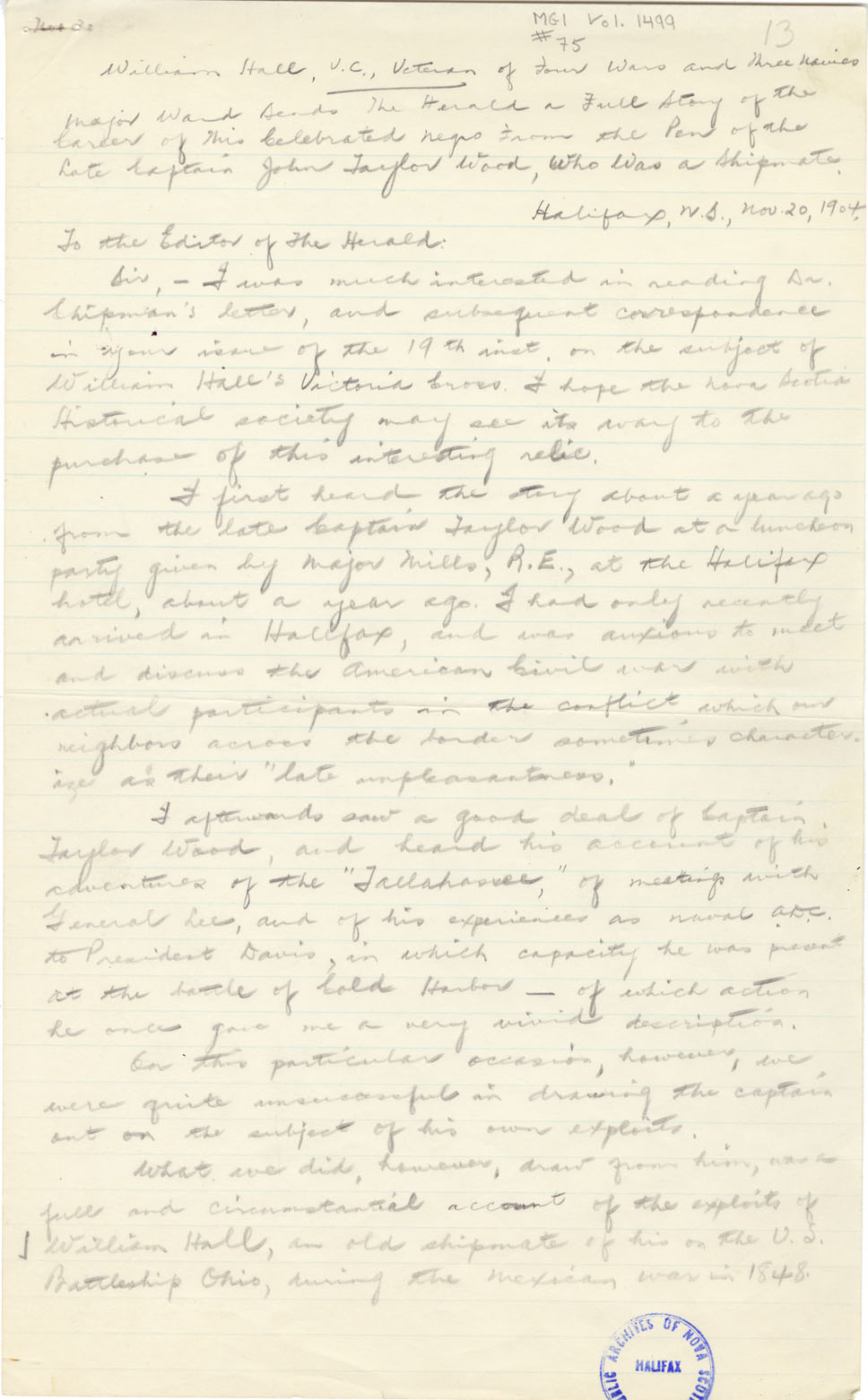 Reference William Hall, VC Nova Scotia Archives MG 1 volume 1499 number 75