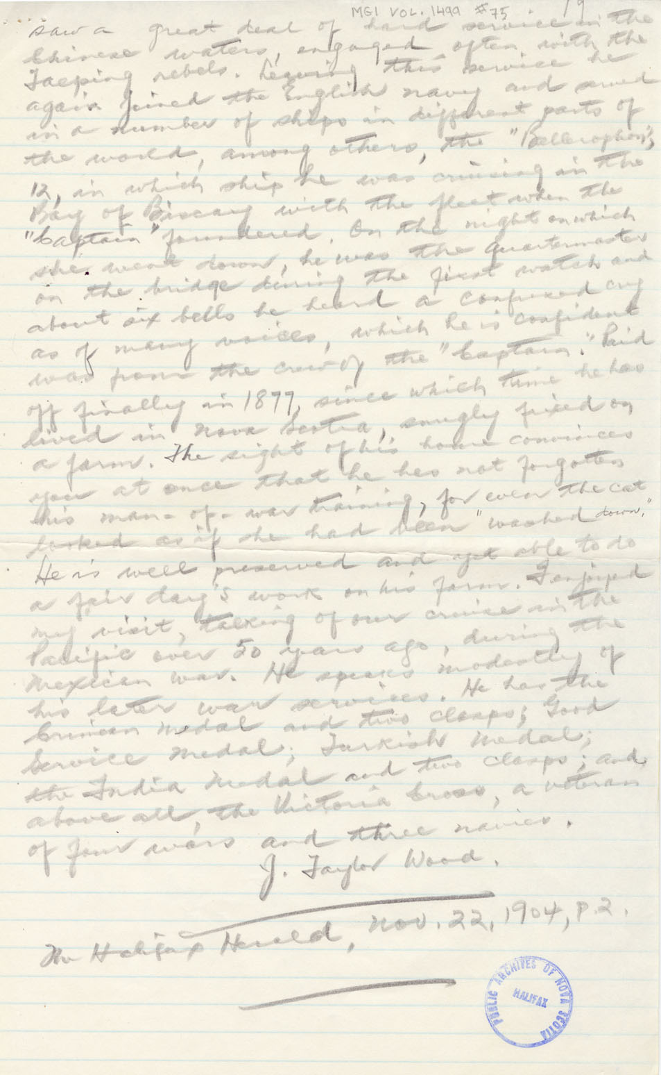 Reference William Hall, VC Nova Scotia Archives MG 1 volume 1499 number 75