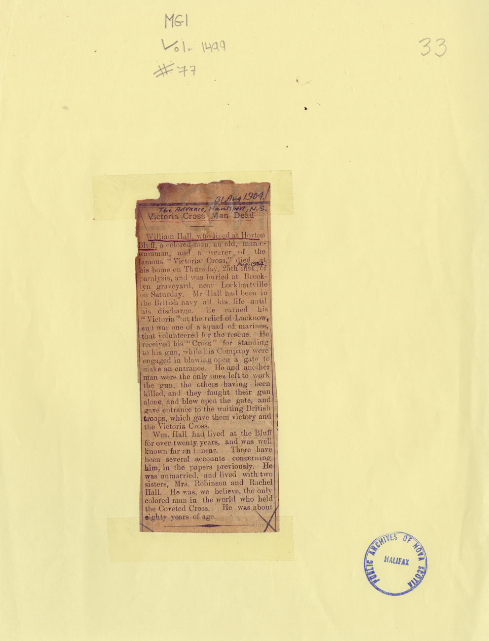 Reference William Hall, VC Nova Scotia Archives MG 1 volume 1499 number 77