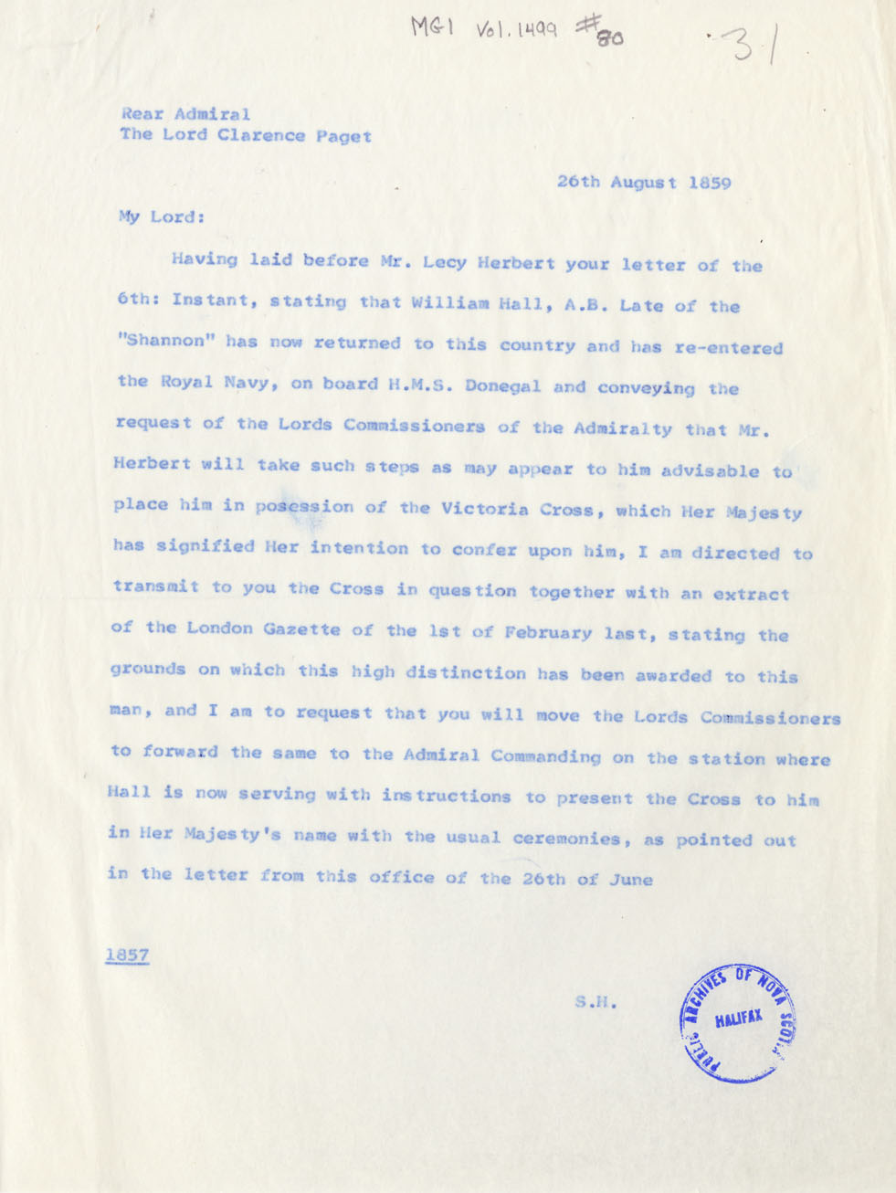 Reference William Hall, VC Nova Scotia Archives MG 1 volume 1499 number 80