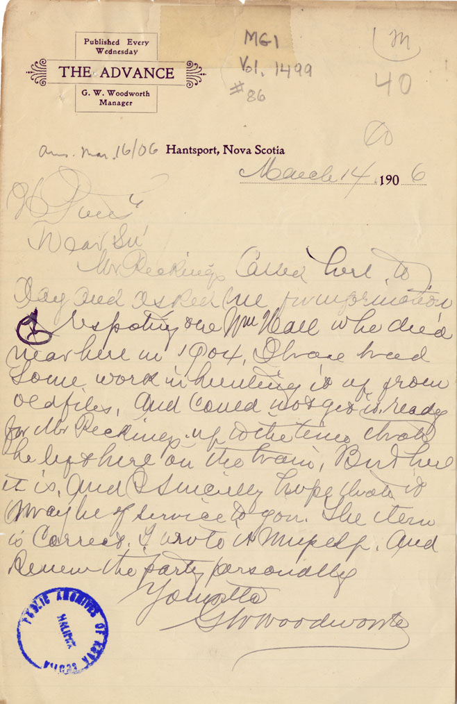 Letter from G.W. Woodworth, The Advance, Hantsport to Harry Piers