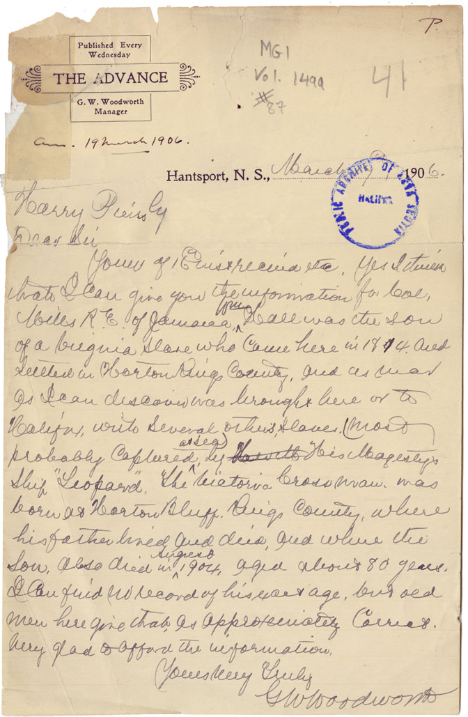 Letter from G.W. Woodworth, The Advance, Hantsport to Harry Piers