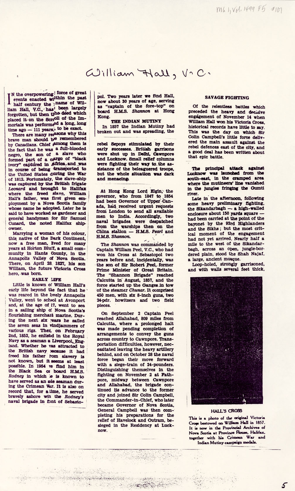 Reference William Hall, VC Nova Scotia Archives MG 1 volume 1499 number 105-108