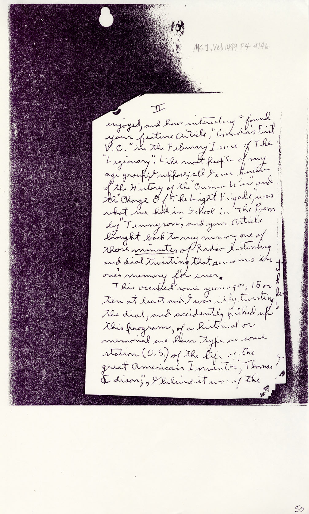 Copy - Thanking him for the expense cheque and describing his experience hearing the Charge of the Light Brigade Bugle by Thomas Edison over the radio.