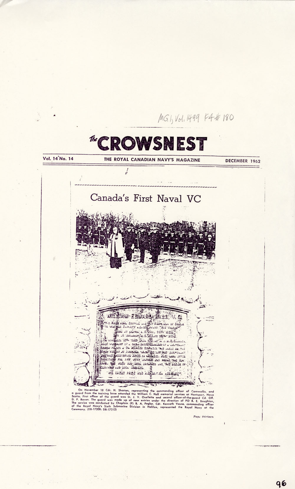 Copy - from The Crowsnest, the Royal Canadian Navy's Magazine, showing the William C. Hall memorial services.
