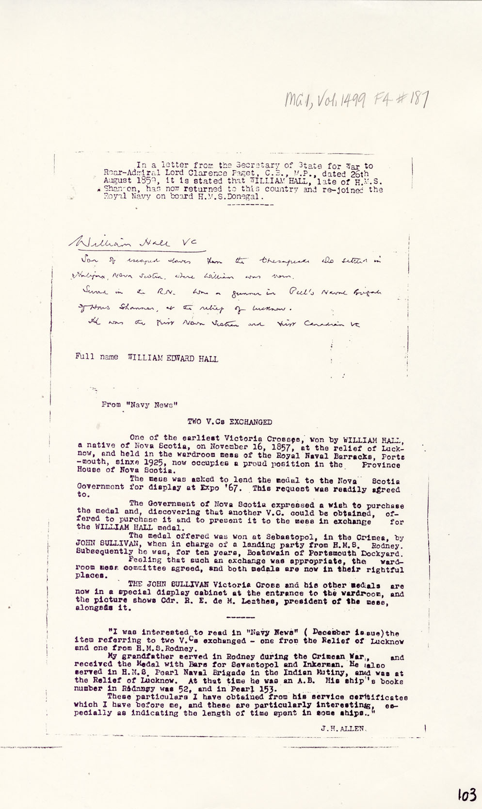 Reference William Hall, VC Nova Scotia Archives MG 1 volume 1499 number 187