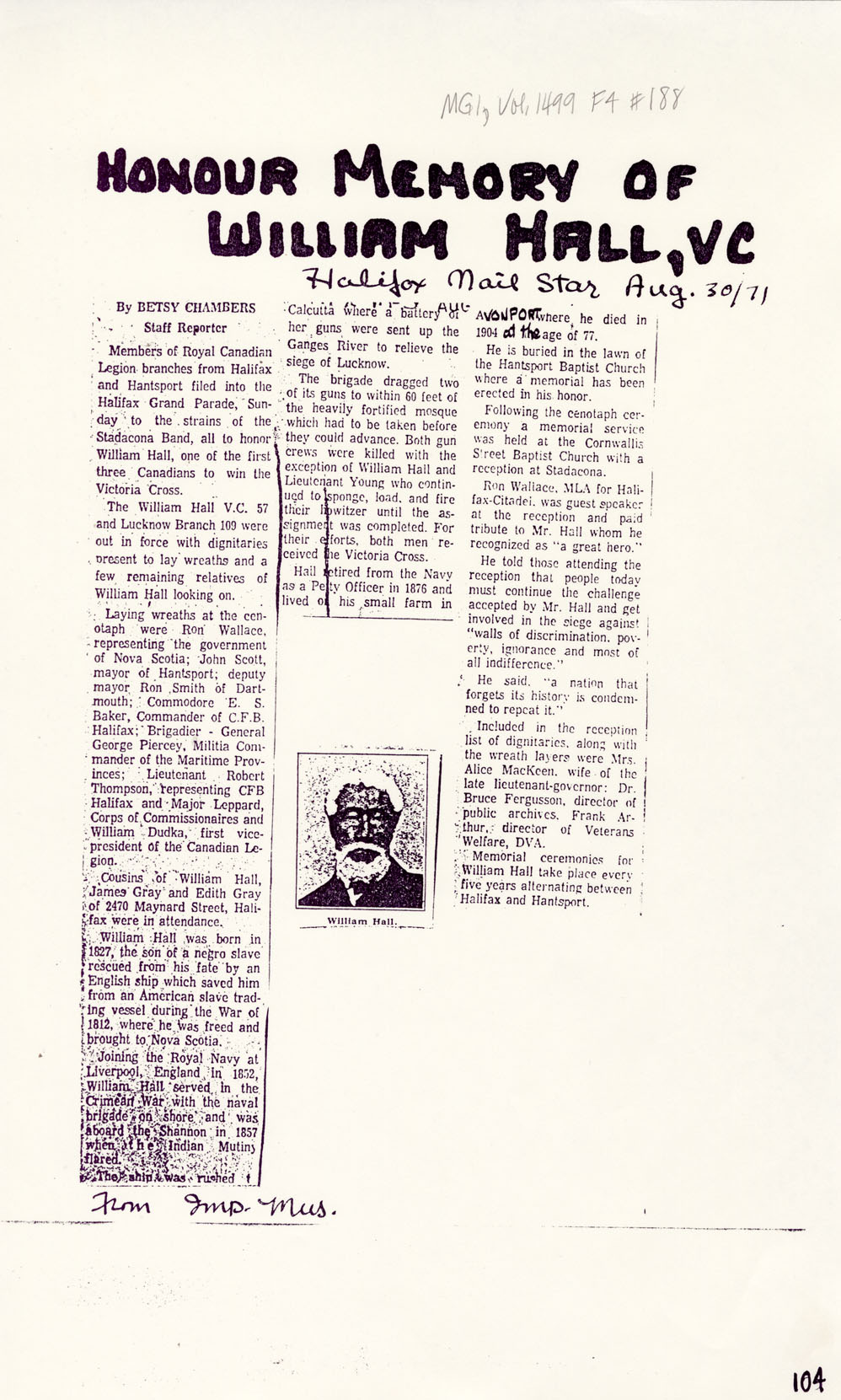 Reference William Hall, VC Nova Scotia Archives MG 1 volume 1499 number 188
