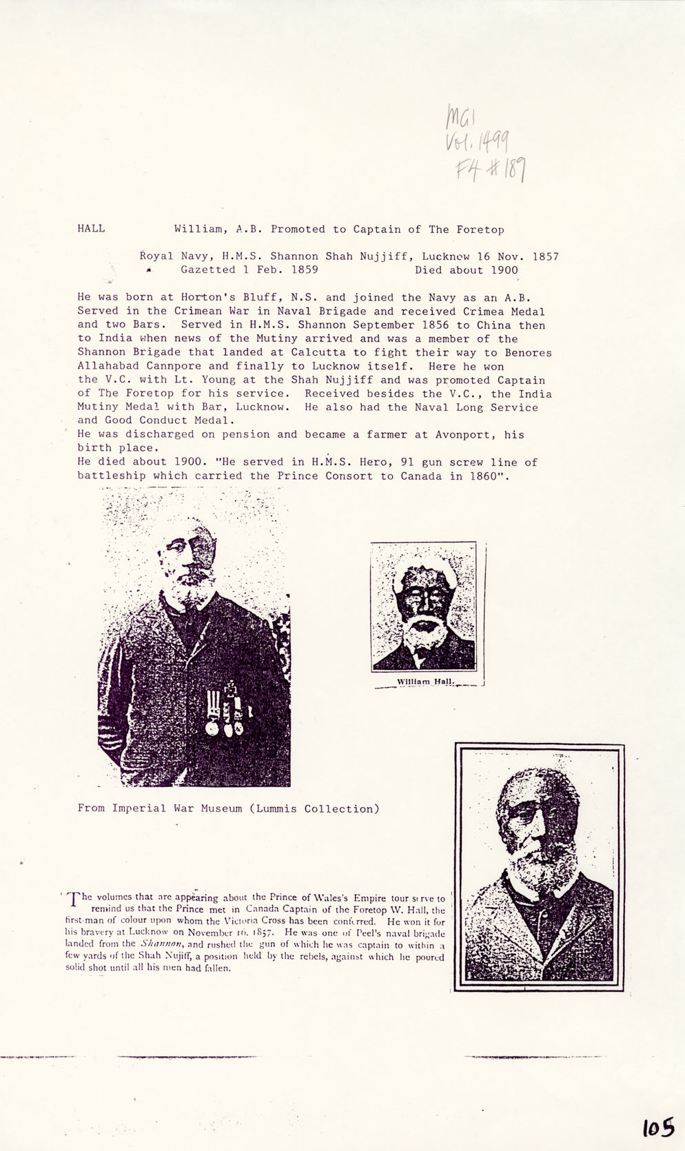 Reference William Hall, VC Nova Scotia Archives MG 1 volume 1499 number 189