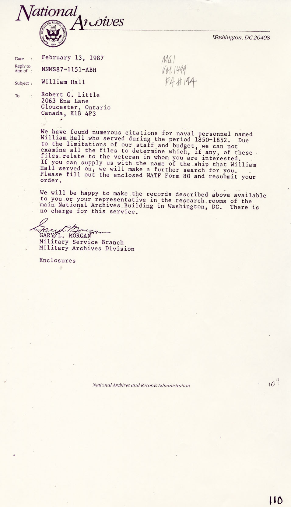 Letter from Gary L. Morgan, National Archives to Robert G. Little