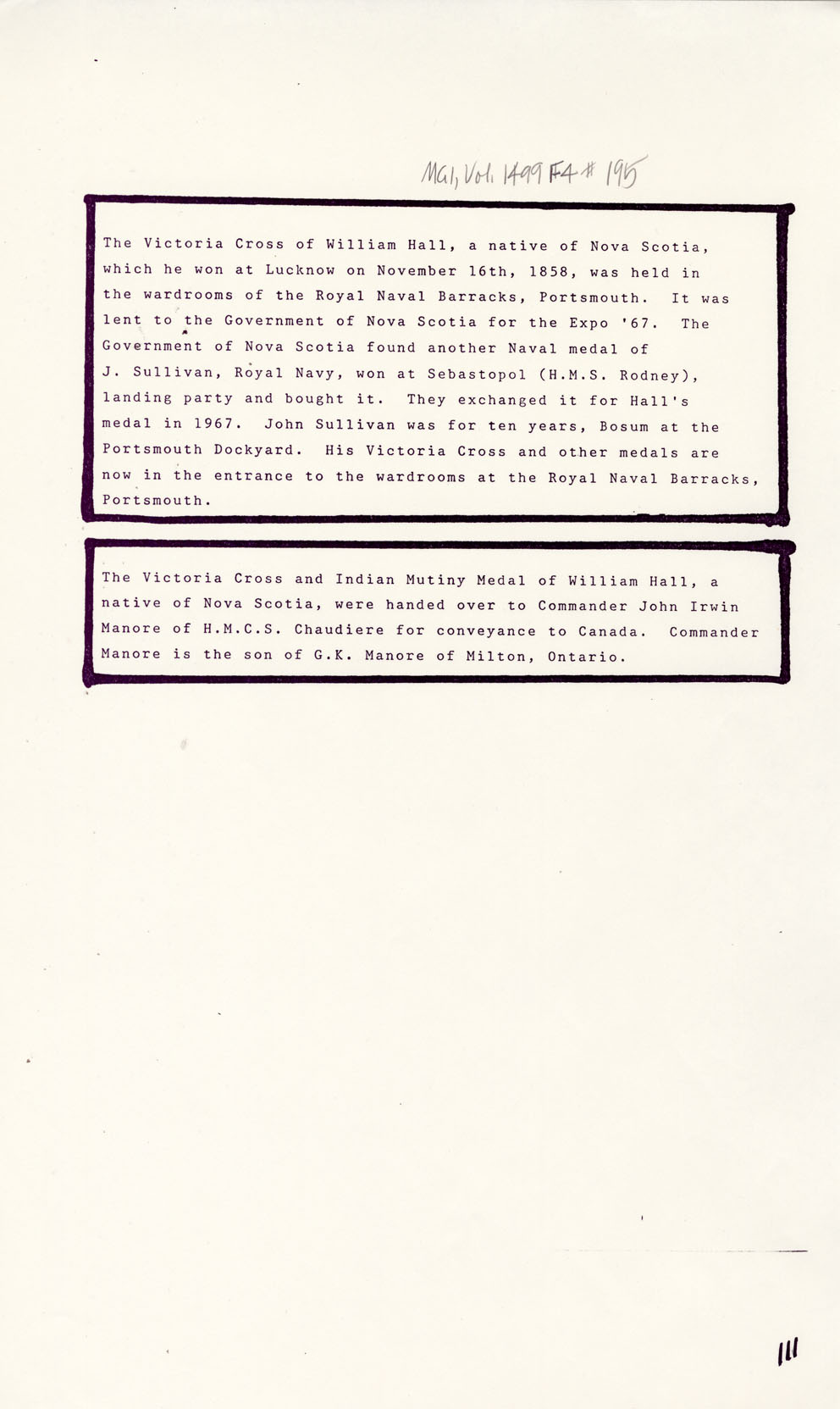 Reference William Hall, VC Nova Scotia Archives MG 1 volume 1499 number 195