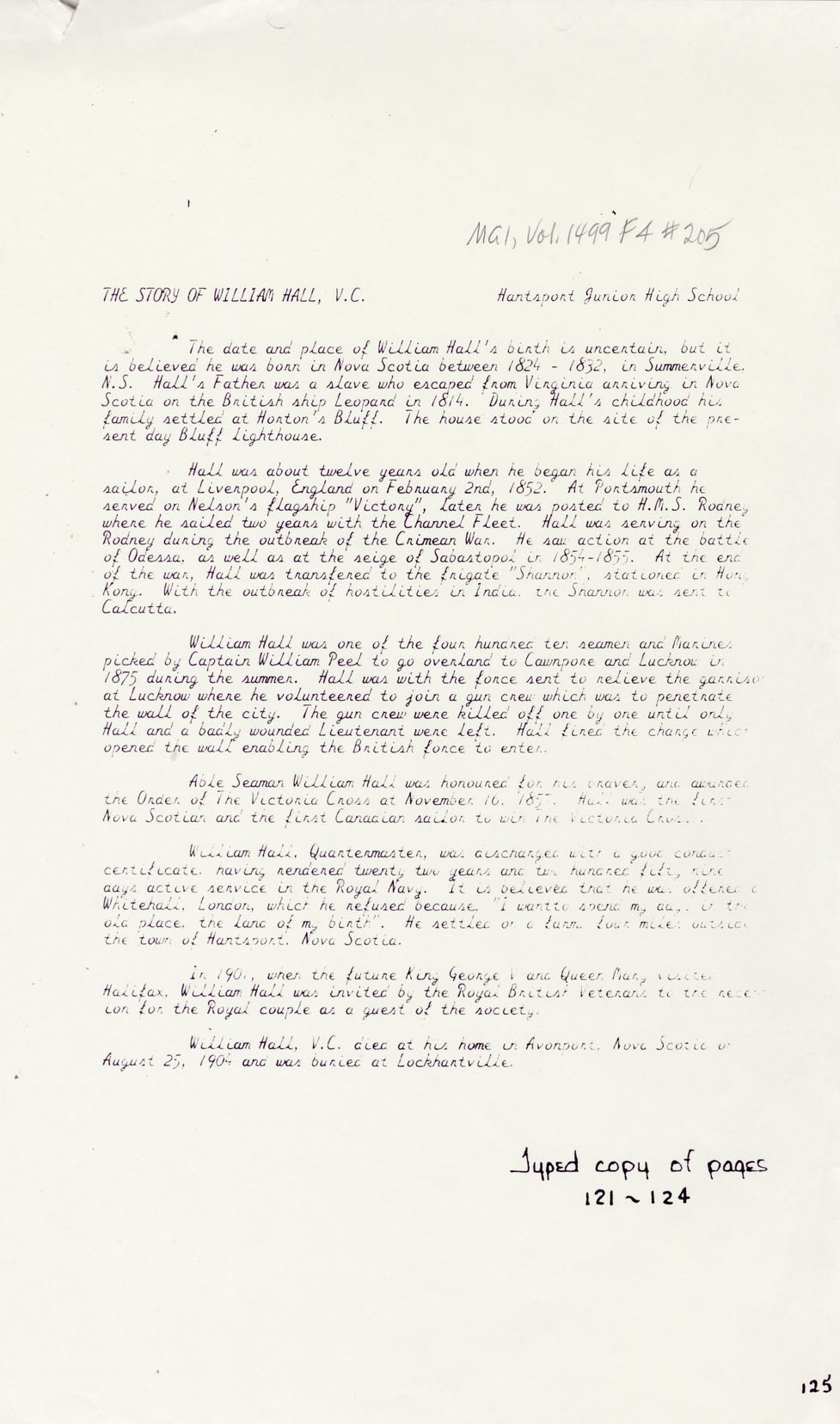 Reference William Hall, VC Nova Scotia Archives MG 1 volume 1499 number 205-206
