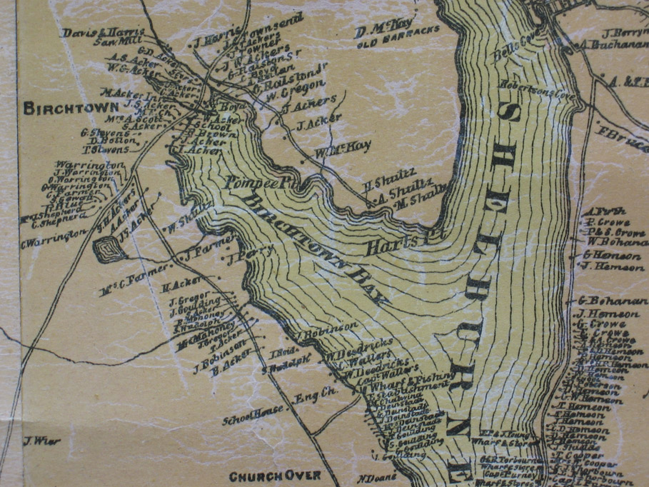 Map shows Birchtown a century after it was founded by African American refugees of the War of Independence. It includes the names of property owners and local landmarks including church, school, store and sawmill.