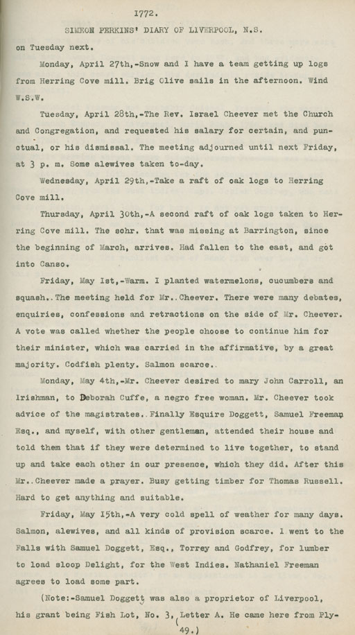 Other entries in Perkins's diary show that, as was typical of the New England Planters, he was a slave owner. The location of Perkins's original diary, vol. 1, is unknown.