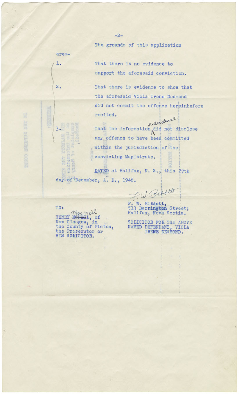 Notice of Motion, affidavits of Viola Desmond, other affidavit, and exhibits for Writ of Certiorari - to be heard 10 January 1947