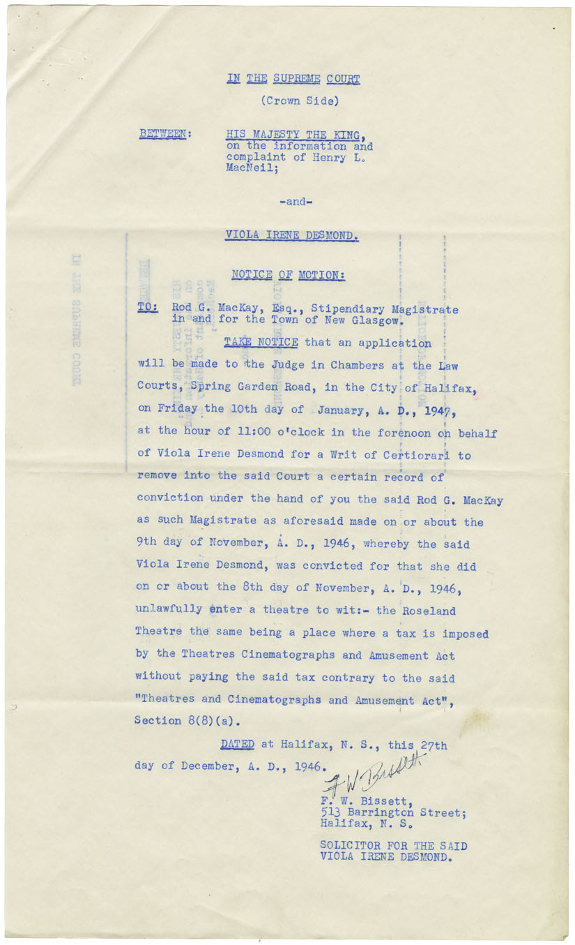 Notice of Motion, affidavits of Viola Desmond, other affidavit, and exhibits for Writ of Certiorari - to be heard 10 January 1947