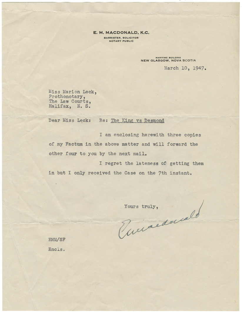 Letter, E.M. MacDonald, New Glasgow, enclosing 3 copies of Factum
