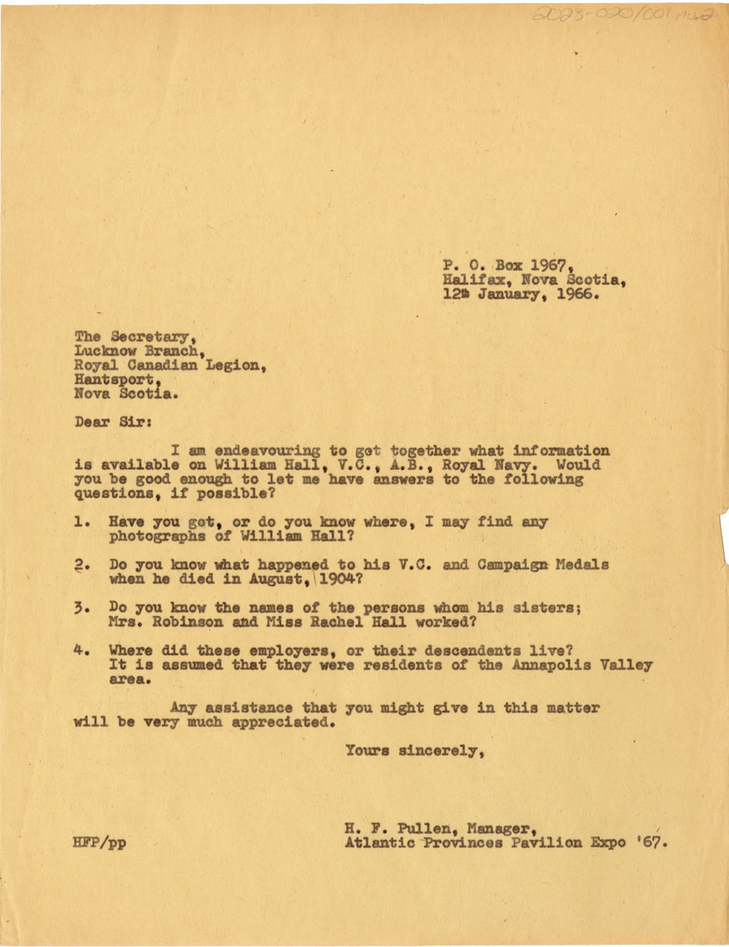 Letter from Pullen to Secretary, Lucknow Branch Royal Canadian Legion