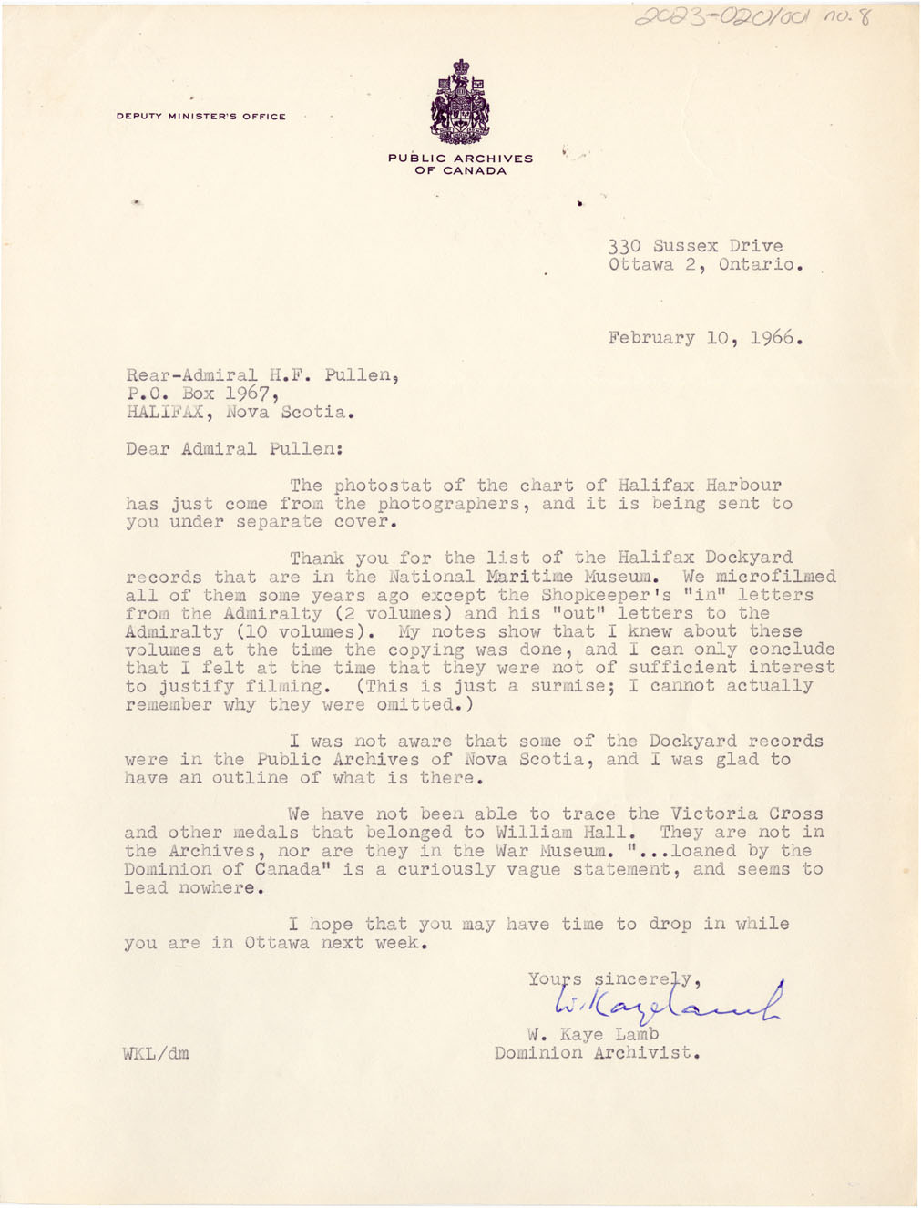 Discussing materials in the Public Archives of Canada and being unable to trace the Victoria Cross and other medals that belonged to William Hall.