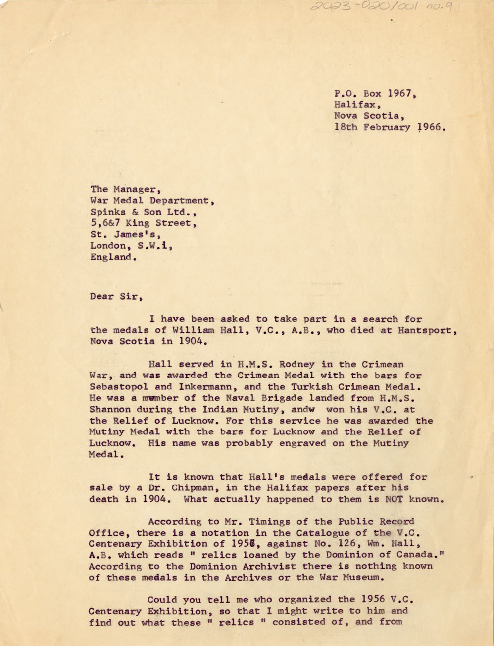 Asking for assistance in locating William Hall's medals and provides information on the history of the medals.