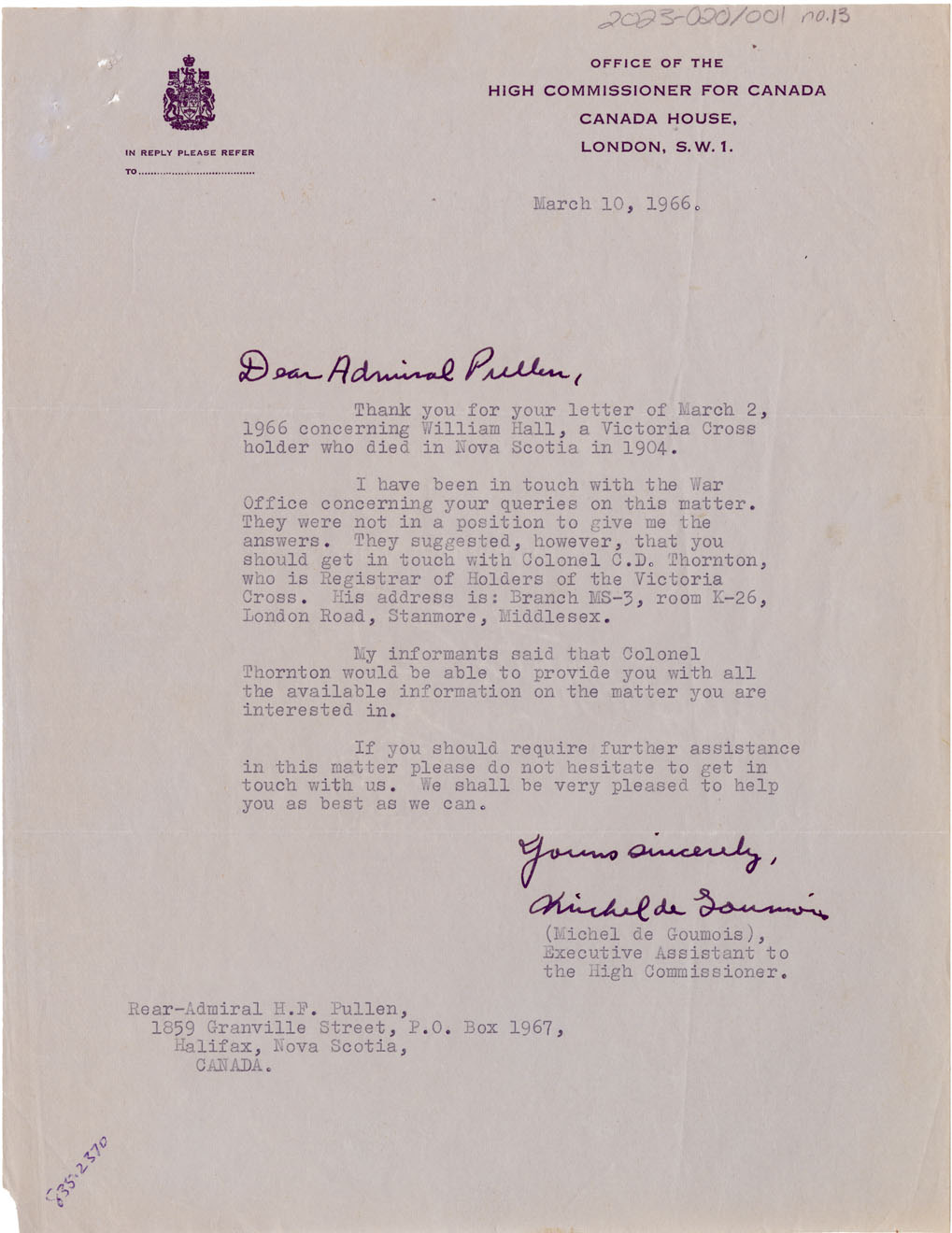 Letter from Michel de Goumois, Executive Assistant to the High Commissioner, Canada House, London