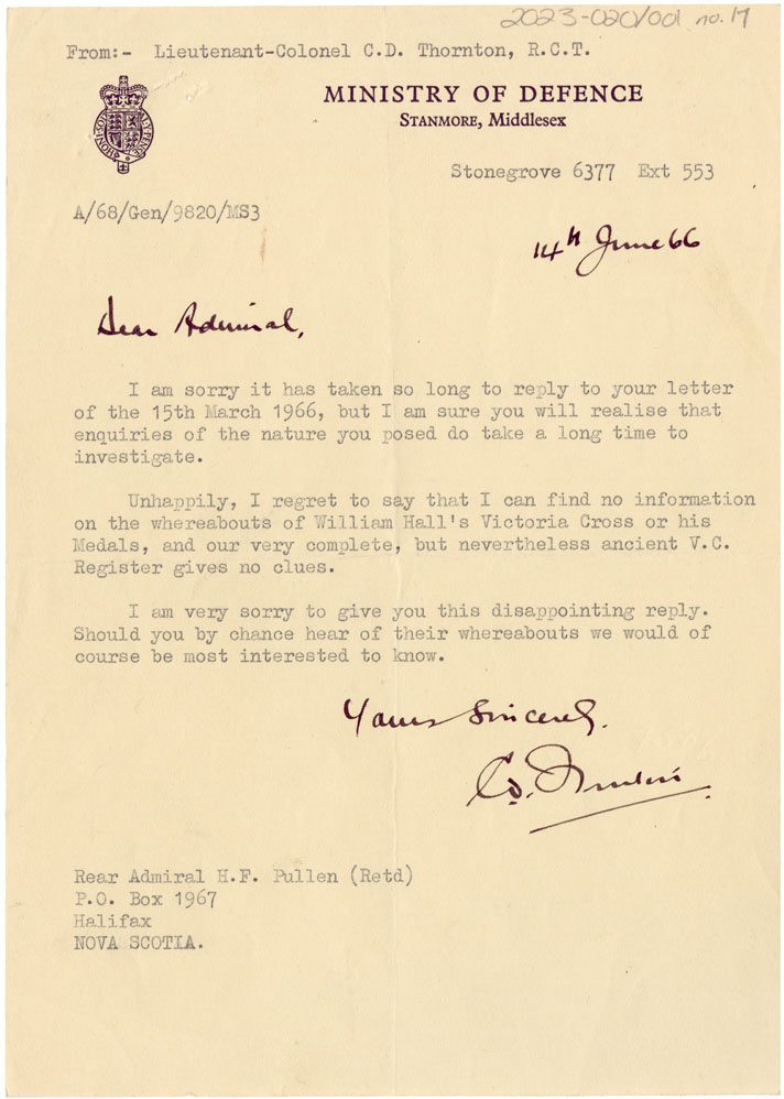Unable to provide more information on the location of William Hall's Victoria Cross.