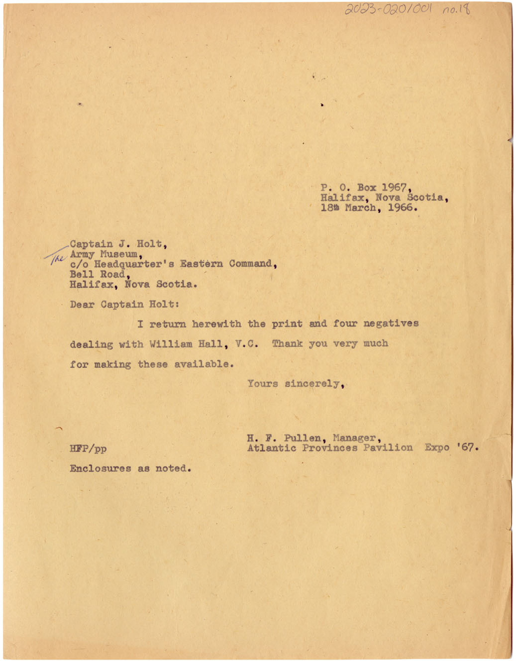 Letter from Pullen to J. Holt, Army Museum, Halifax