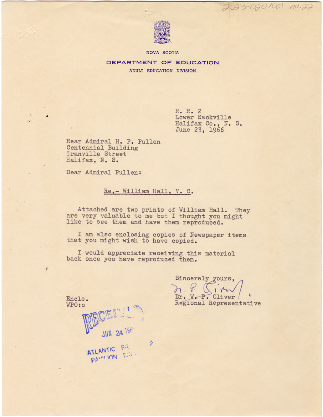 Letter from W.P. Oliver, Nova Scotia Department of Education