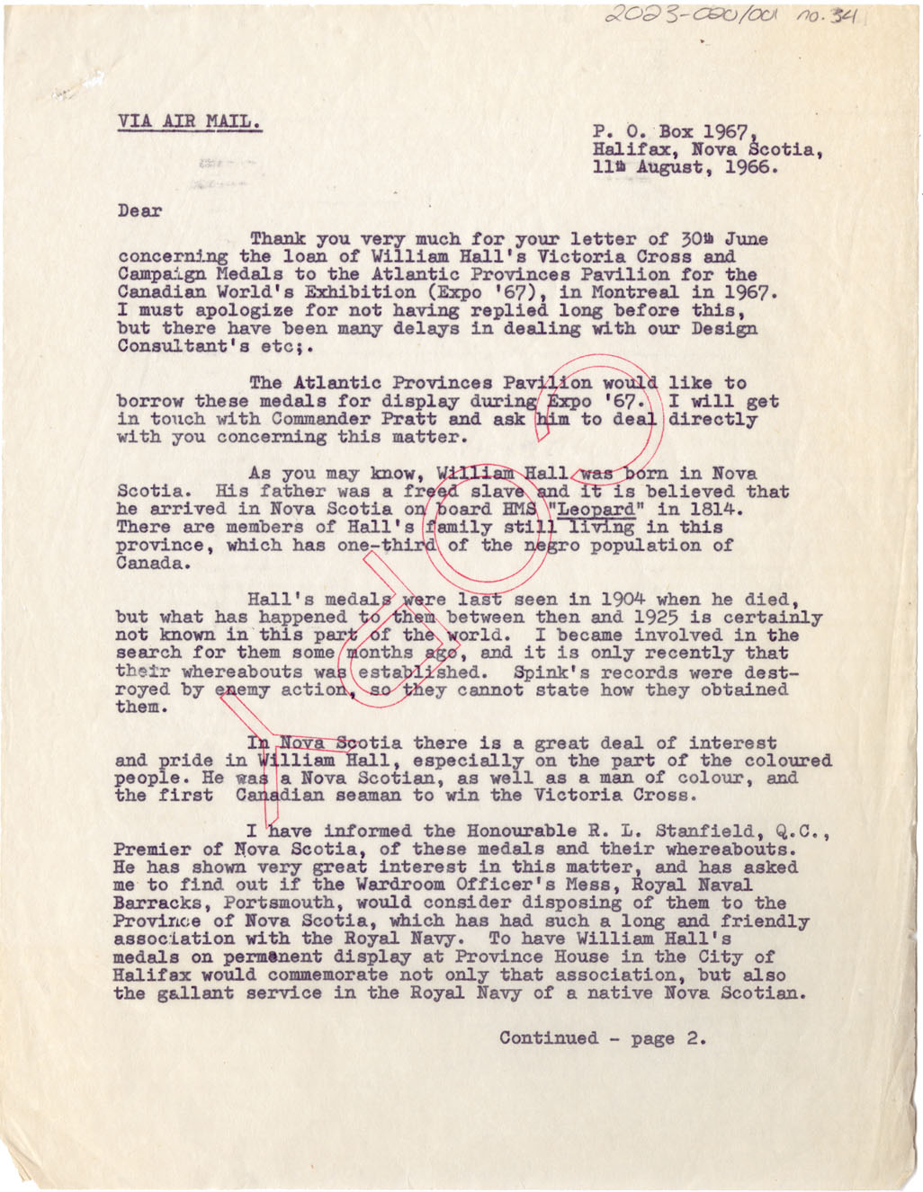Copy - reply to 30 June letter, about the loan of William Hall's Victoria Cross medals to the Atlantic Provinces Pavilion for the Canadian World's Exhibition (Expo '67). Pullen mentions the potential of having the medals on permanent display at Province House in Halifax.