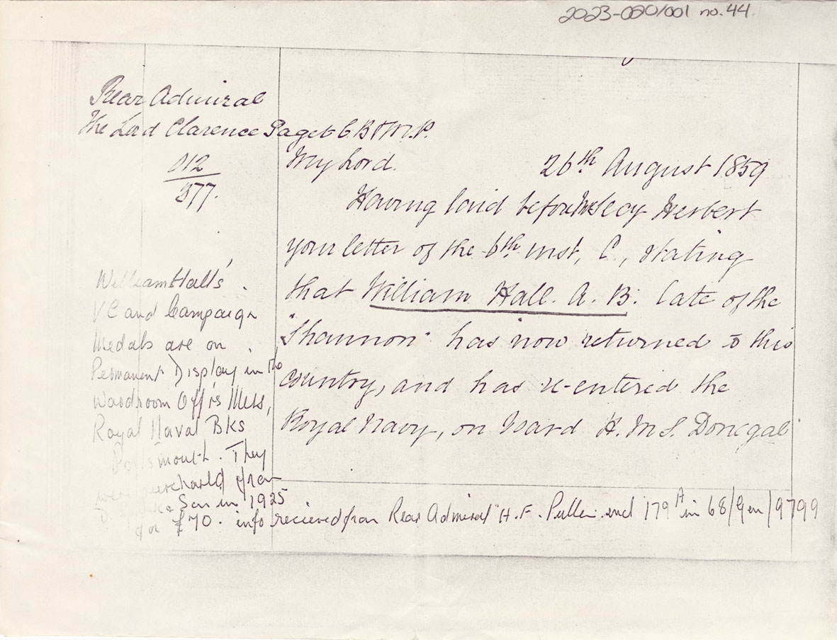 Dated 26 August 1859. Letter containing a request that the Admiralty forward the Victoria Cross to the Admiral commanding the Station where Hall was serving.