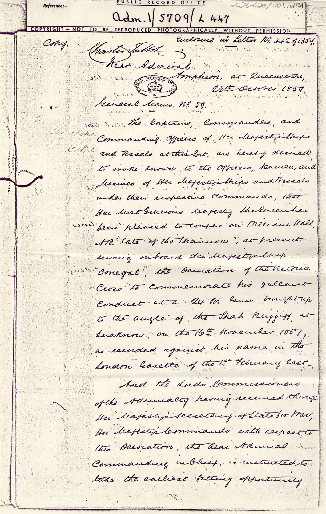 Photocopy of Public Record Office: ADM.1/5709 No. L447 dated 31 October 1859.