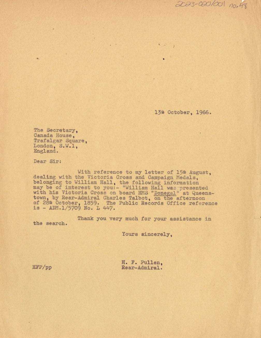 Informing that he found the Admiralty records referring to the presentation of Hall's Victoria Cross.