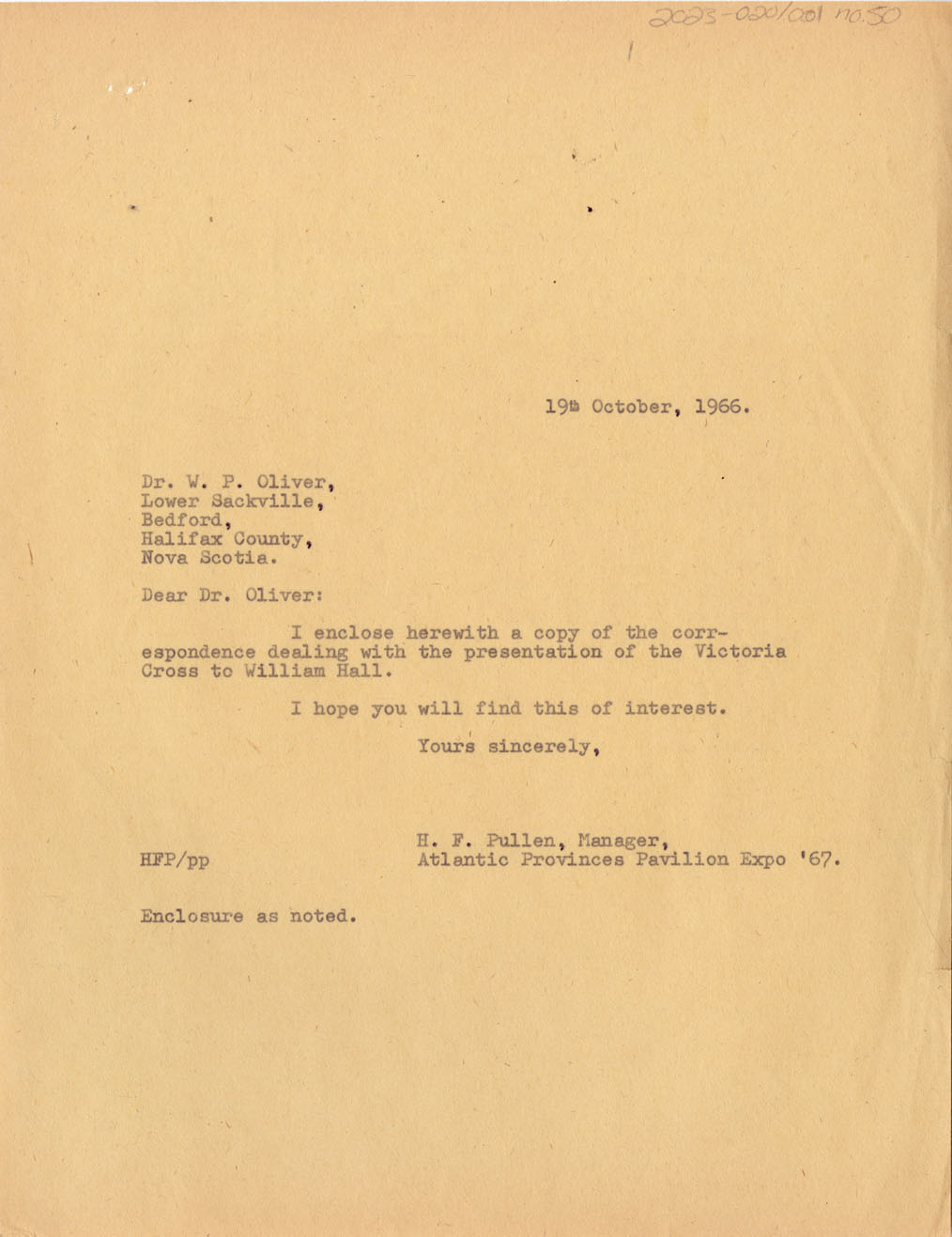 Informing that he found the Admiralty records referring to the presentation of Hall's Victoria Cross.