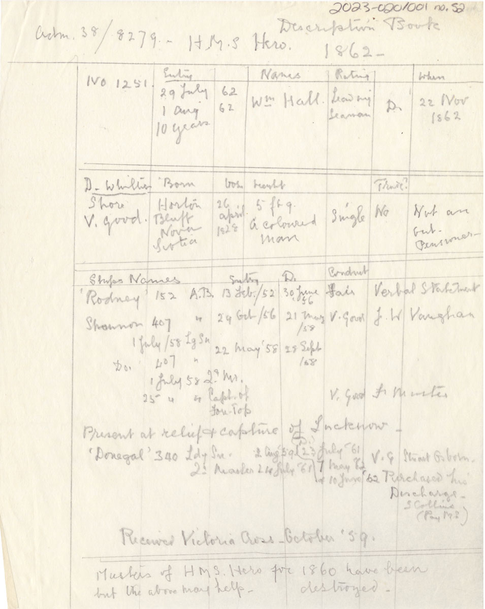 Providing handwritten transcripts relating to Hall's naval service from Public Records Office documents.