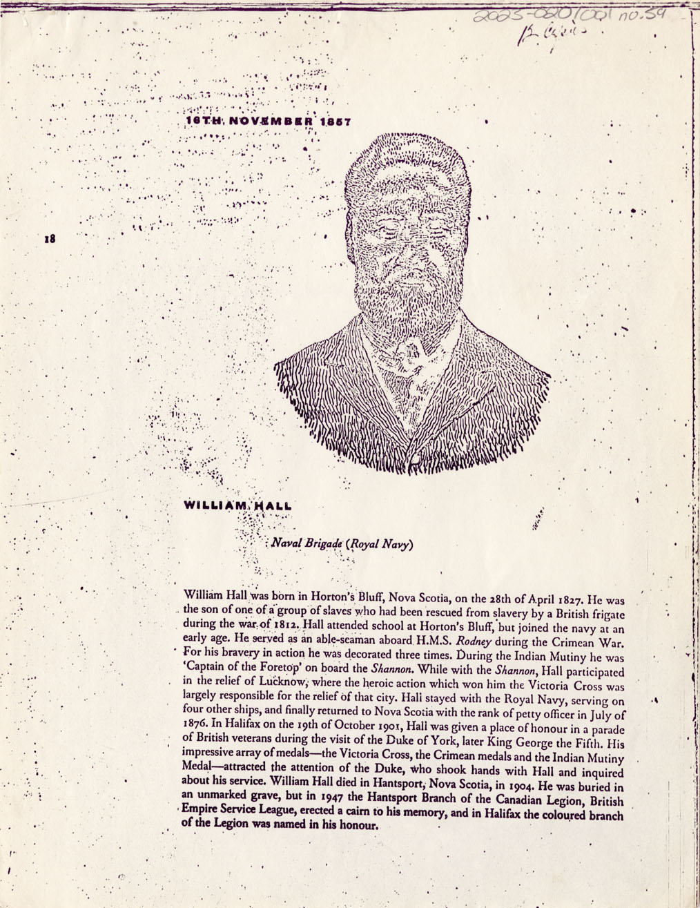 With transcript of 31 October 1859 "Presentation of Victoria Cross", and June 1947 article on Hall from Nova Scotia Department of Education's Journal of Education.