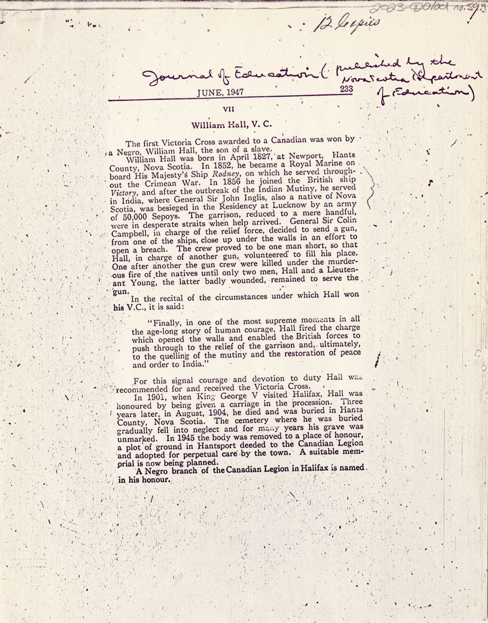 With transcript of 31 October 1859 "Presentation of Victoria Cross", and June 1947 article on Hall from Nova Scotia Department of Education's Journal of Education.