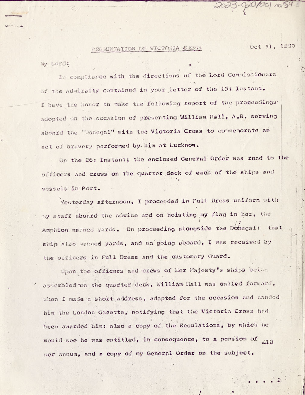 With transcript of 31 October 1859 "Presentation of Victoria Cross", and June 1947 article on Hall from Nova Scotia Department of Education's Journal of Education.