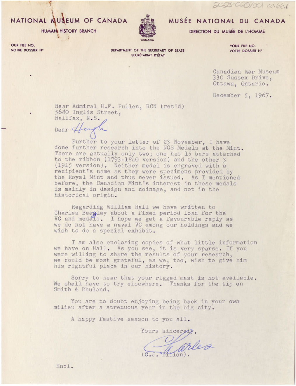 Reply from Canadian War Museum to Pullen's of November 23, 1967 regarding the Museum's holdings of Canadian Naval Service Medals.