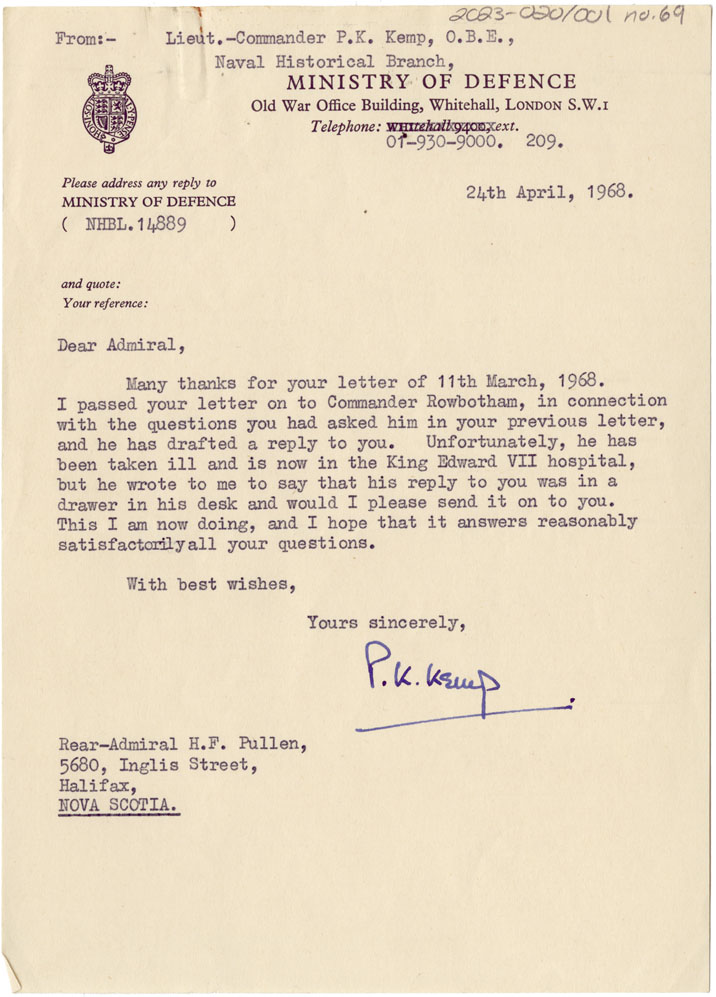 Letter from P.K. Kemp, Ministry of Defence, London to Pullen