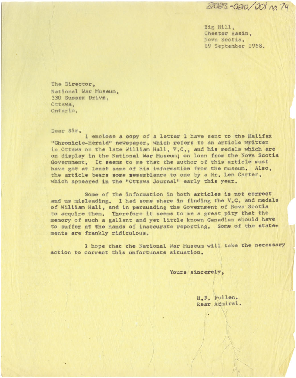 Letter discusses Pullen's letter of 18 September 1968 to the Editor of the Halifax Chronicle Herald and expressing some concerns about the accuracy of some information believed to have had its source with the National War Museum.
