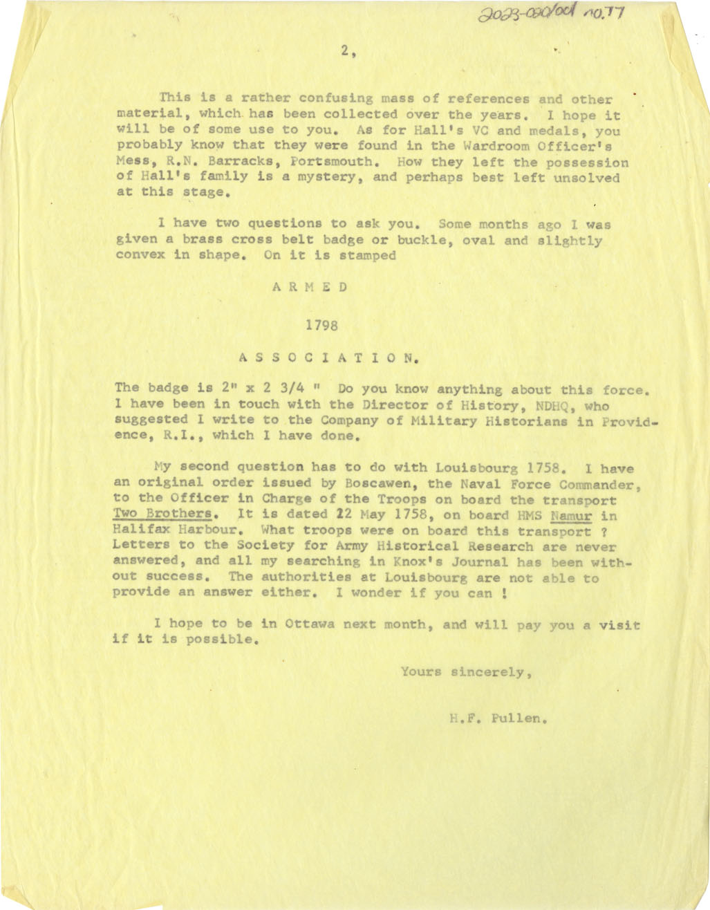 Letter from Pullen to L.F. Murray, National War Museum, Ottawa