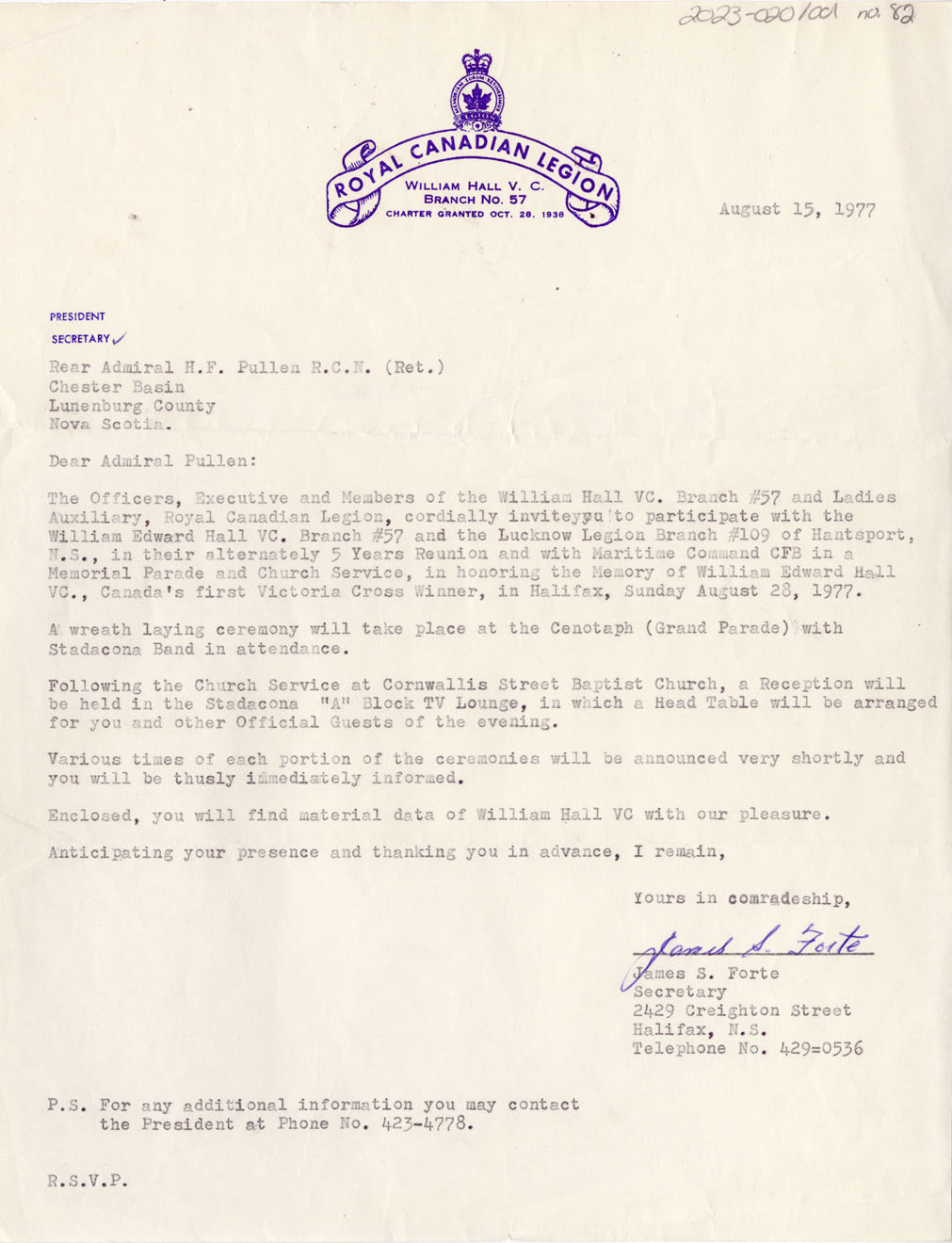 Letter to Pullen from James S. Forte, Secretary, Royal Canadian Legion Branch #57