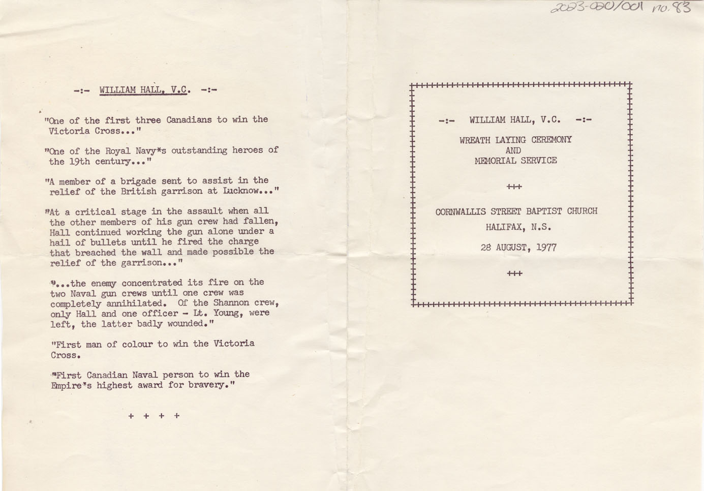 Programme for a William Hall, VC, Wreath Laying Ceremony and Memorial Service
