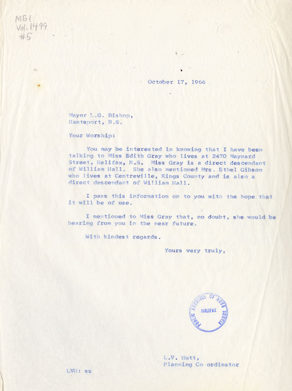 Letter from L. V. Hutt to Mayor L. G. Bishop, Hantsport