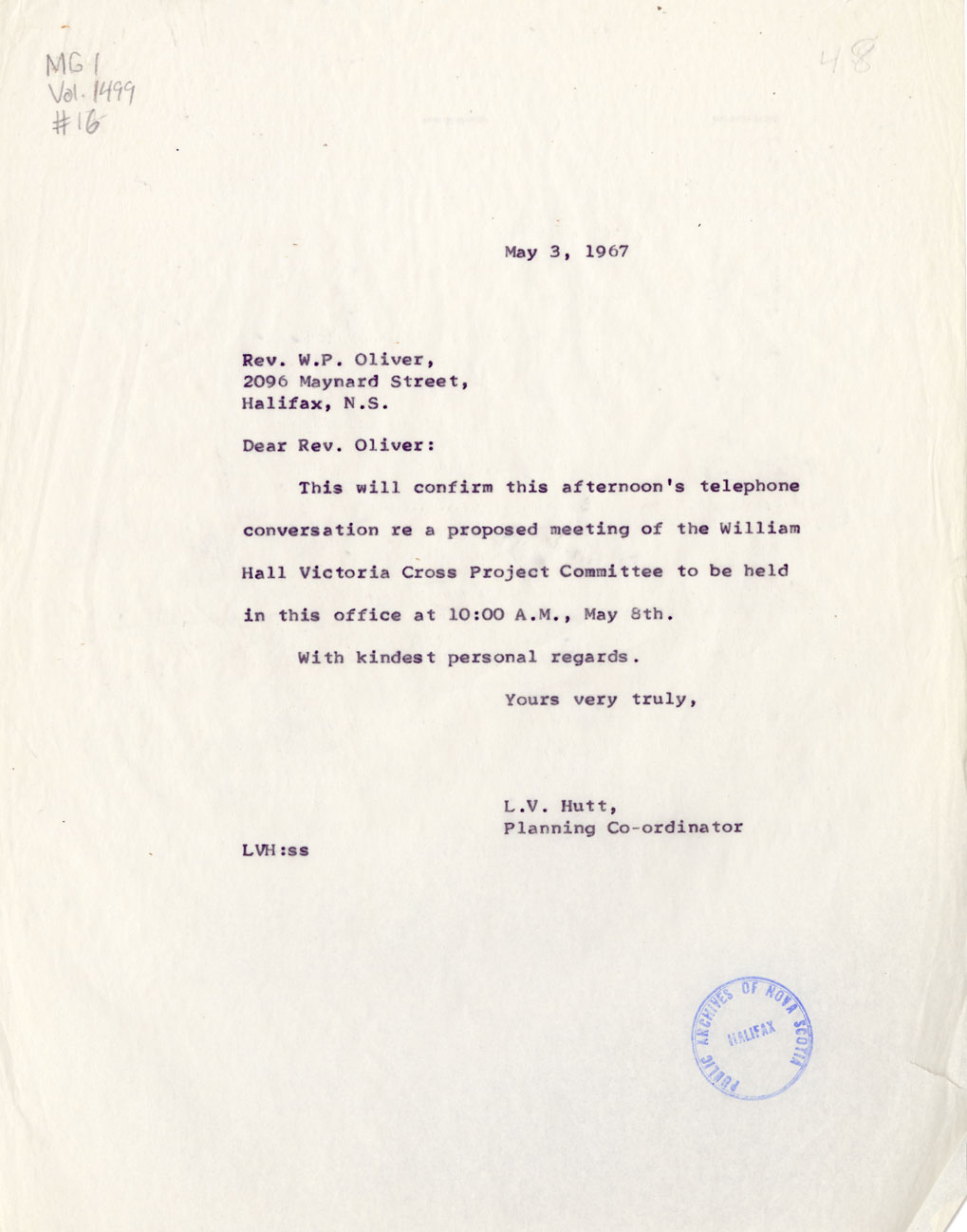 Letter from L.V. Hutt to Rev. W.P. Oliver