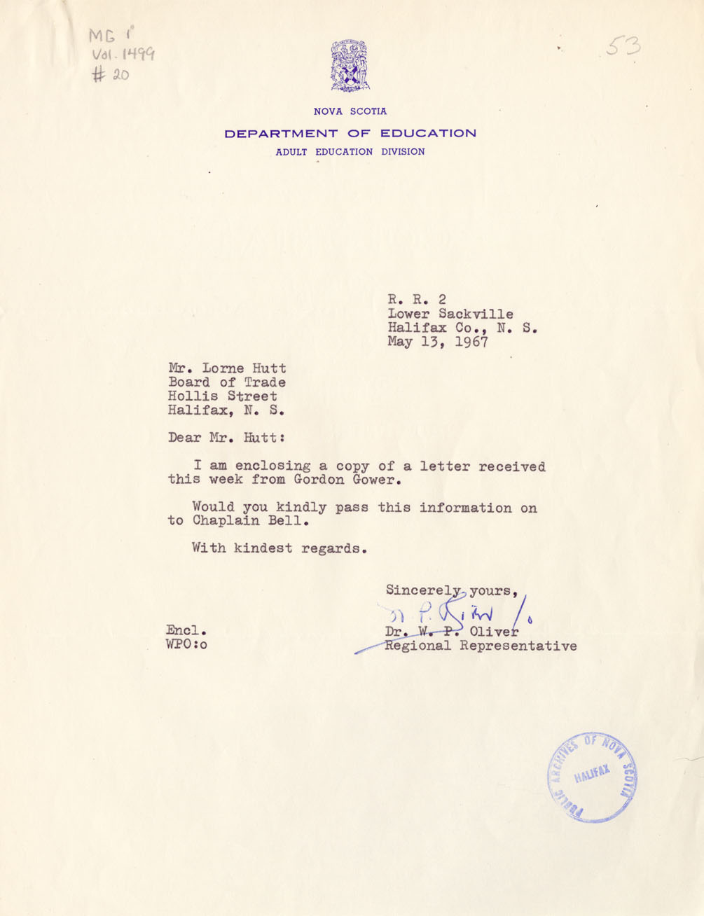 Letter from Rev. W.P. Oliver to L.V. Hutt