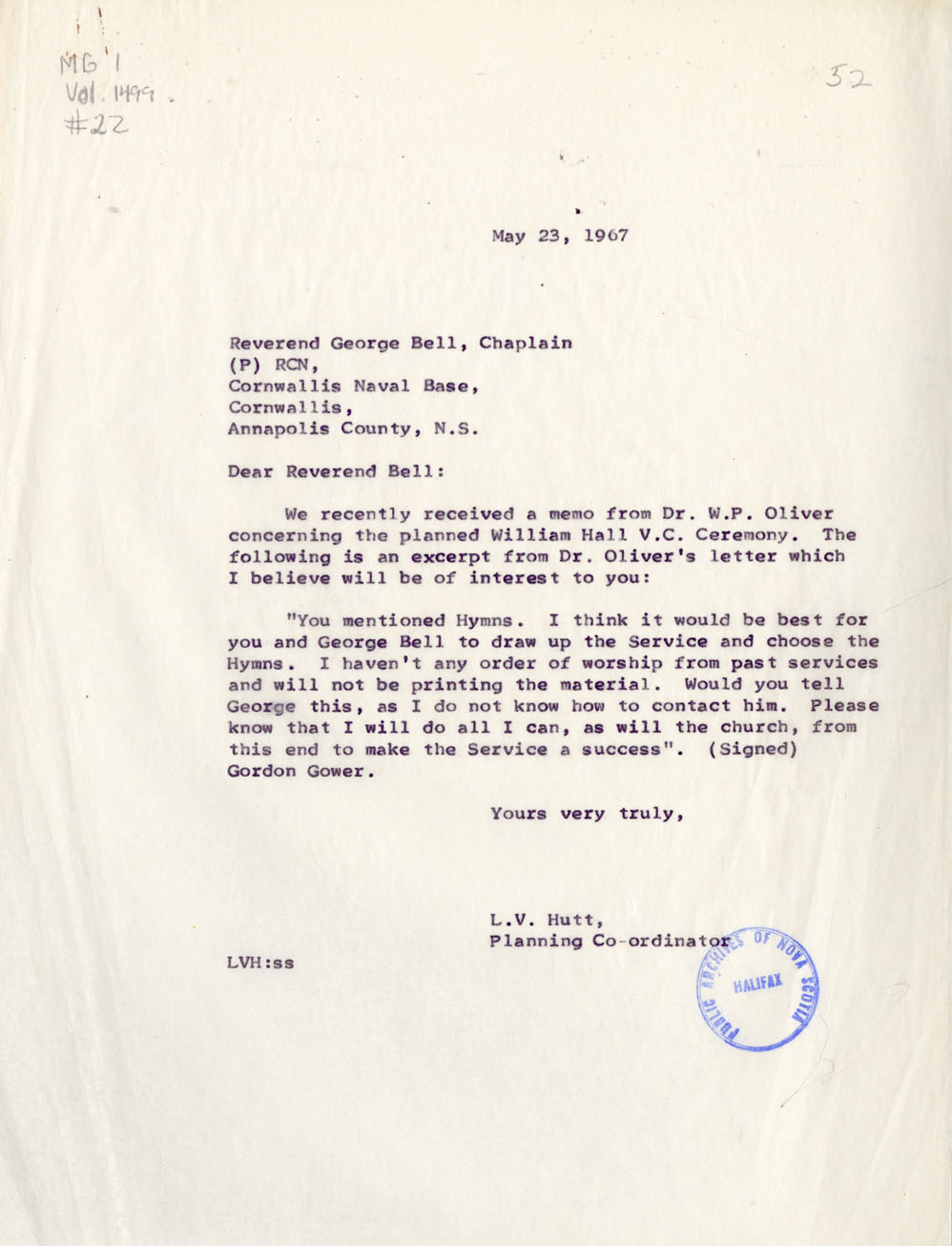Letter from L.V. Hutt to Rev. George Bell