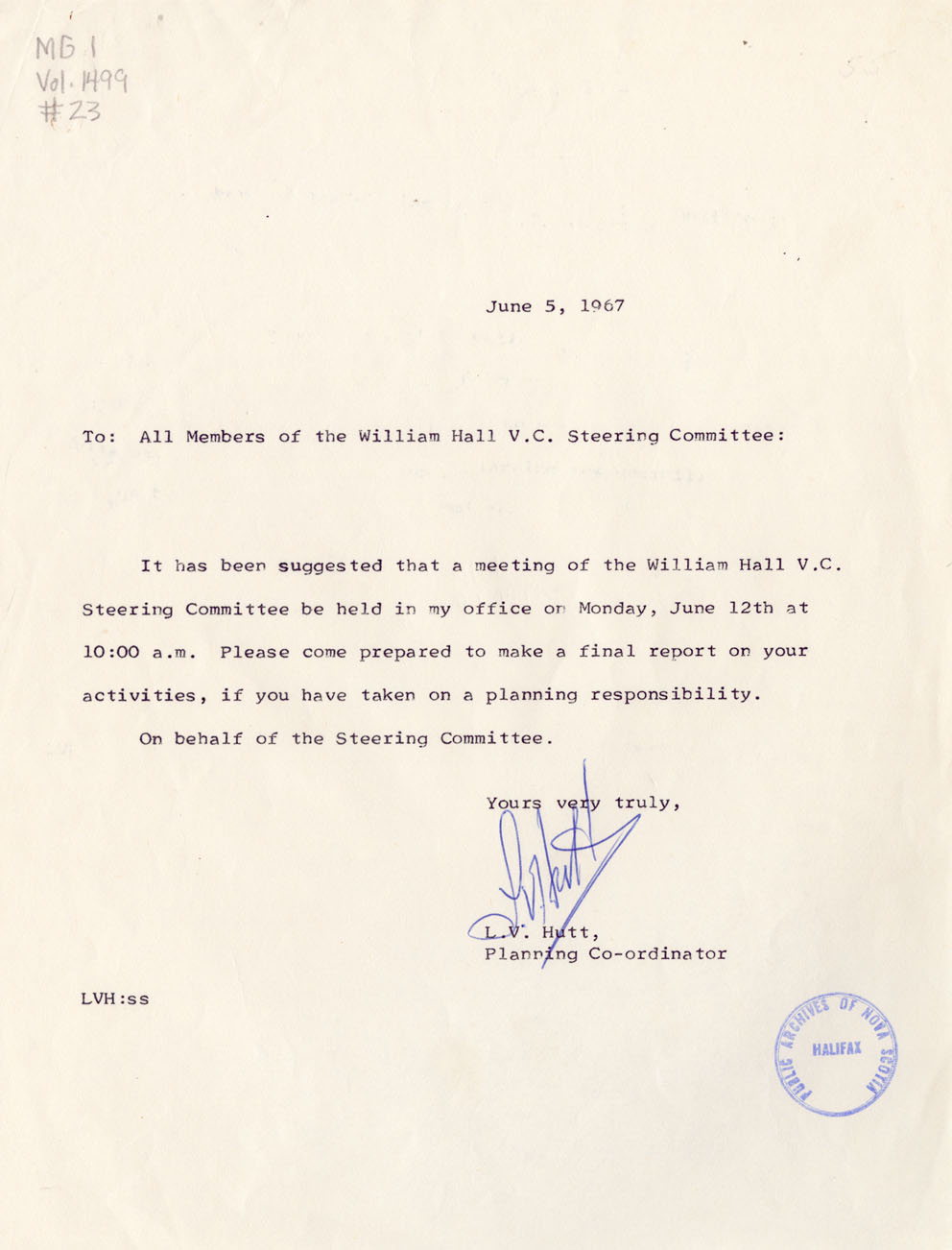 Letter from L.V. Hutt to all members of the William Hall, Victoria Cross Steering Committee