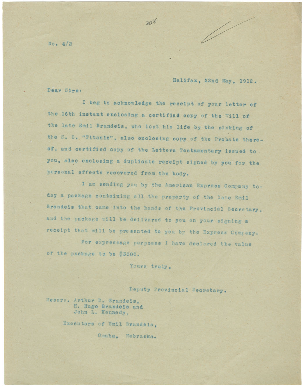 Disposition: Forwarded to Mrs. Brandeis, Omaha, Neb., May 2nd.