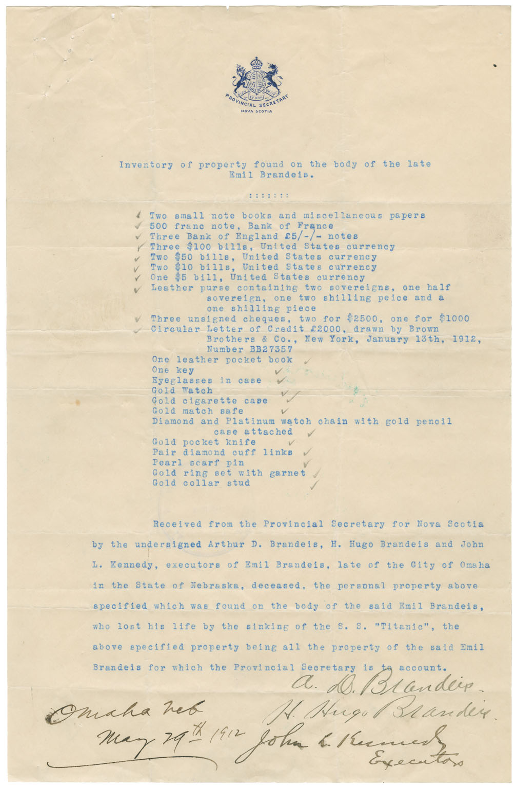 Disposition: Forwarded to Mrs. Brandeis, Omaha, Neb., May 2nd.